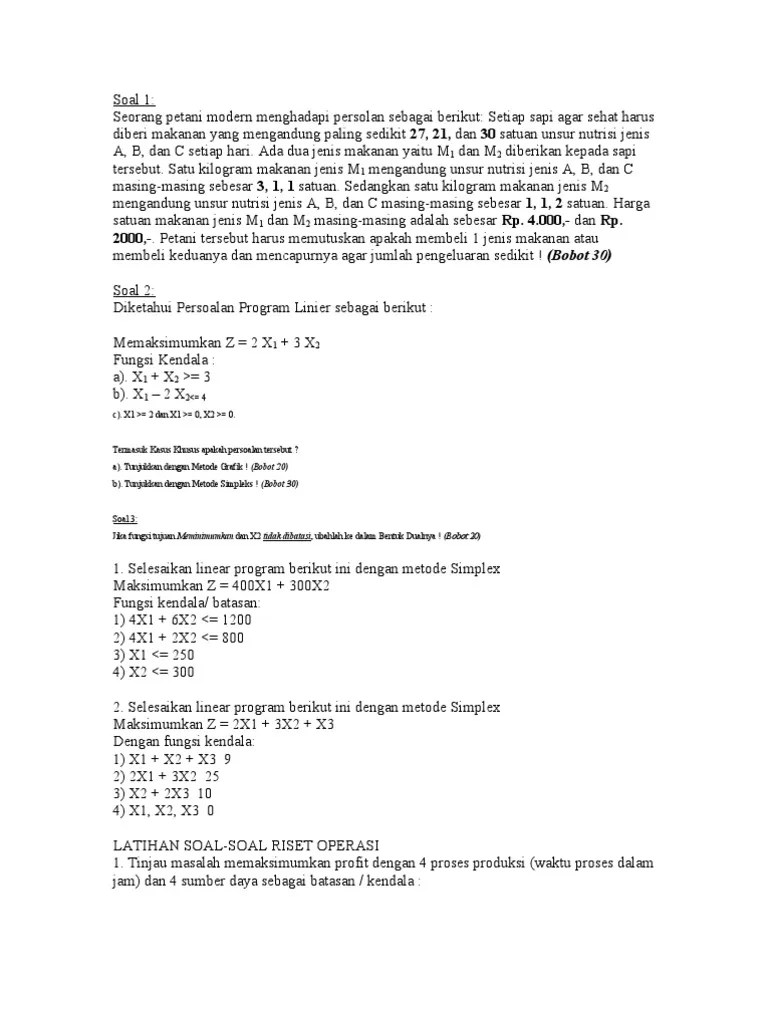 Agar lebih paham perhatikan contoh soal di bawah ini : Contoh soal dan jawaban riset operasi metode simpleks untuk batasan 1 sebesar 8 batasan 2 sebesar 15 dan batasan 3 sebesar 30. Tidak ada nilai z dalam daerah feasible yang akan dipilih. Kelompok 1, 2, 3, 4, . Contoh soal 2.2 ditampilkan dalam tabel 2.5 sebagai berikut: . Model model riset operasi september 6, 2016 in operasional research. List topik bahasan program linear | riset operasibab 1 konsep : Pert.4 kasus khusus dalam simpleks. Eb07 akan membuat kain sutra dan kain wol, yang terbuat dari benang sutra 3kg untuk pembuatan kain sutra dan benang sutra… Pemrograman linear dan penyelesaianya dengan metode grafik. Contoh soal linier menggunakan metode grafik dan jawabannya. Linier, serta penyelesaiannya dengan metode grafik. Seperti contoh di depan yang sudah kita selesaian dengan metode grafis, kita selesaiakan dengan metode simplex.